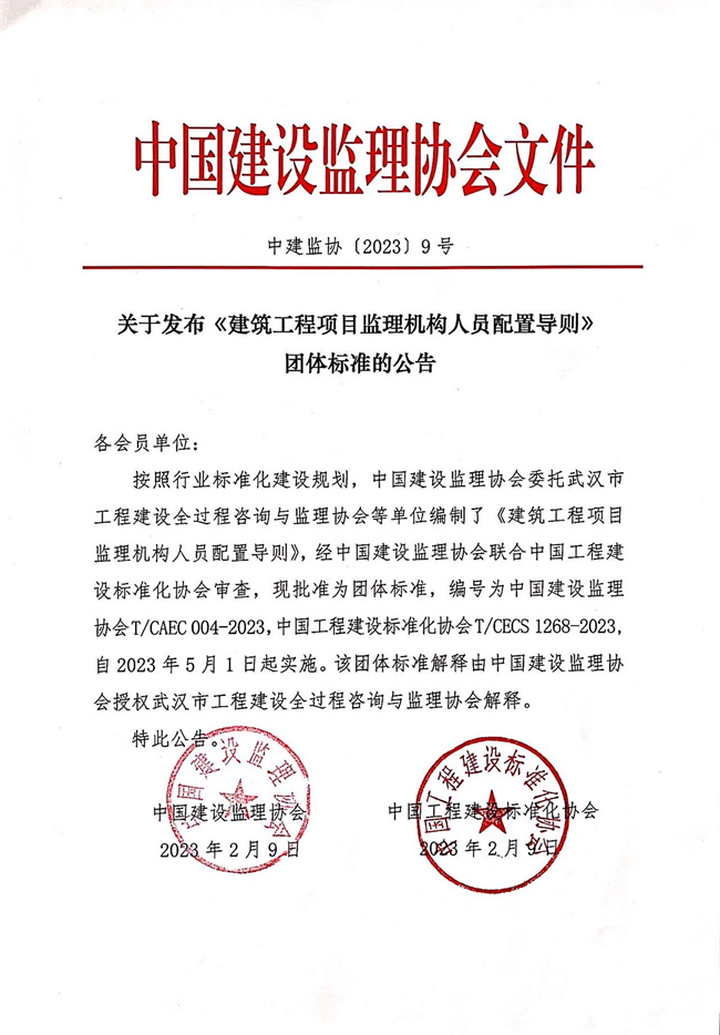 十大现金买球入口发布《建筑工程项目监理机构人员配置导则》团体标准的公告